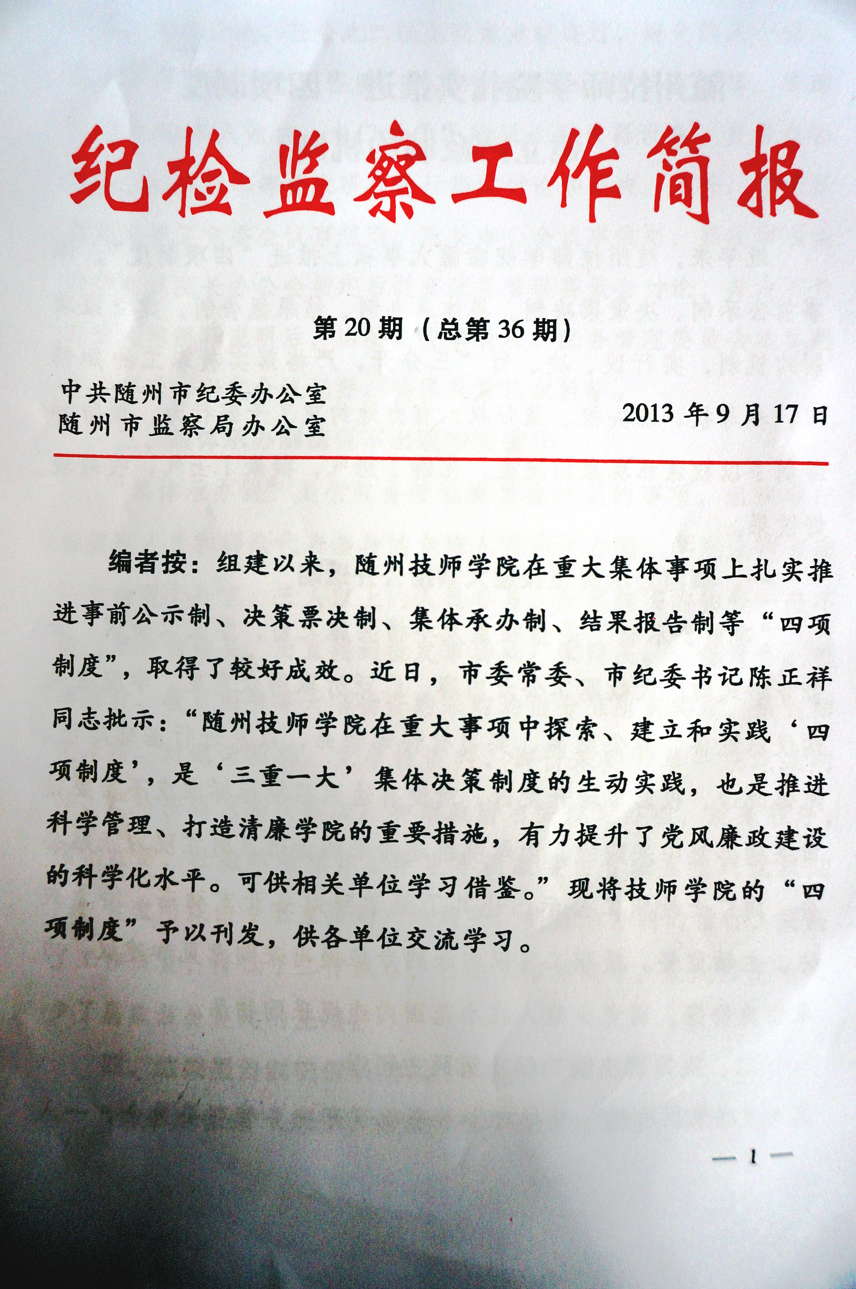 隨州技師學院組建以來,對學(xué)院內重大事項建(jiàn)立和實施事前(qián)公示製、決策票決製、集體承辦製、結果報告製(簡(jiǎn)稱“四製”),規範了管理,減少了決策失誤,防止和遏製了腐敗(bài),收(shōu)到良好(hǎo)效果。