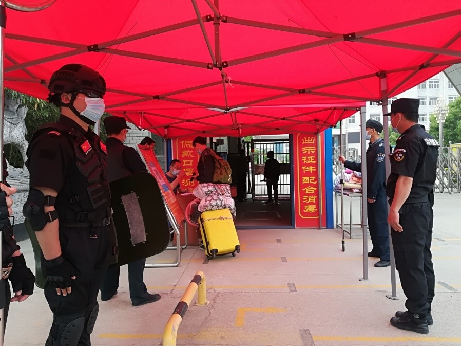 在高新(xīn)區公安分局巡防二隊的巡查和協助下,學生們下車後有序進入校門口檢測點,依次檢(jiǎn)測入校。