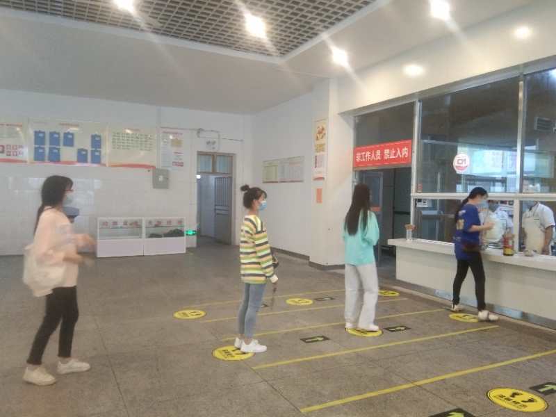 同學們按引導標識排(pái)隊取餐、間隔就餐(cān)。